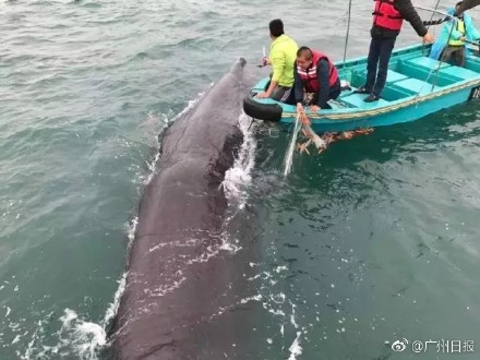 3月12日上午,深圳杨梅坑的渔民,好像捕到了一个不得了的大家伙。走近一看,坏了!这竟然是一头鲸鱼,被渔网缠住了,动弹不得。 (图片来源:广州日报)