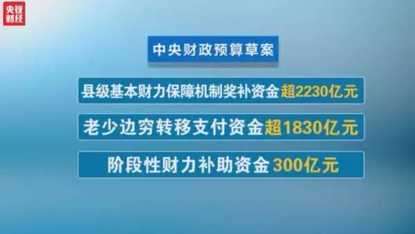 减税的同时,该花的钱却不会少。财政部部长肖捷表示,今年中央财政预算草案进一步加大了对地方、特别是困难地区的财政支持。拟安排县级基本财力保障机制奖补资金2230多亿元,安排老少边穷转移支付资金1830多亿元,还安排阶段性财力补助资金300亿元。