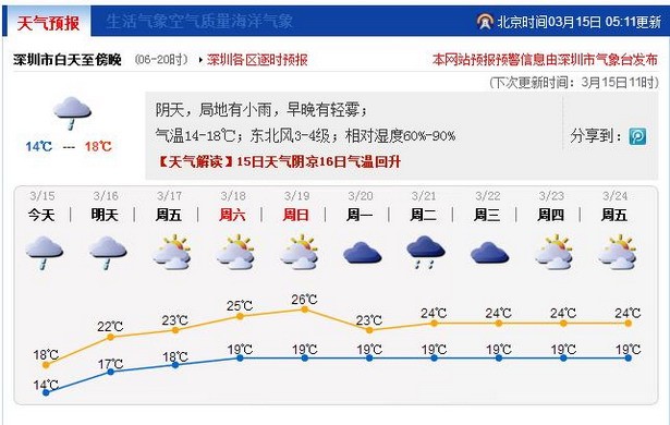 在冷空气持续影响下,15日鹏城将以阴沉天气为主,局部还会出现小雨。气温持续下降,最低气温降至14℃左右,北部及山区再低1℃-2℃。市民应注意天气变化,谨防疾病。早晚有轻雾,最低能见度降至6公里以内,驾车出行应注意交通安全。