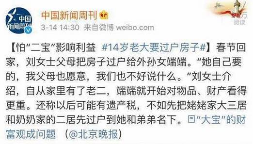 “这次春节回老家,我父母把房子过户给女儿端端了。”闺蜜聚会时,当刘女士和大家说这话时,大家都感到很惊讶:按继承顺序,她父母的房子应该给她,而不是隔辈儿给呀。 “她自己要的,我父母也愿意,我们也不好说什么。”刘女士介绍,自从家里有了老二,端端就开始对物品、家里的财产看得格外重。