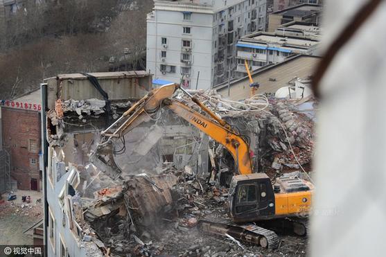 惊险!两台挖掘机“爬”上楼顶赶工期