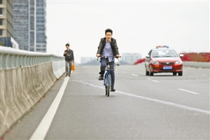 14日下午15时左右,记者在益田路与福华一路交叉路口看到,没有设置非机动车道和人行道的深南-益田立交桥上,出现了一些骑着自行车的人和拖着行李的行人,他们不顾旁边呼啸而过的小车,大摇大摆从立交桥上通过。执勤民警不断地将违反规定的路人、骑行者拦下,进行宣传、教育。