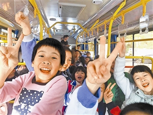 坐上了通往校门口的公交车,孩子们十分开心。