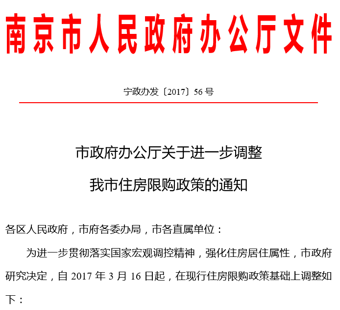 今日傍晚,南京市政府网站发布消息称,为贯彻落实国家因城施策、分类调控的要求,坚持“房子是用来住的,不是用来炒的”,强化住房居住属性,促进房地产市场平稳健康发展,南京市发布了《市政府办公厅关于进一步调整我市住房限购政策的通知》,明确自3月16日起,在原有调控政策的基础上,进一步调整现有的住房限购政策。