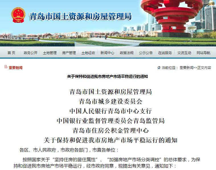 同样是在今天,比南京稍早一些,青岛市国土资源和房屋管理局等部门下发通知称,按照国家关于“坚持住房的居住属性”、“加强房地产市场分类调控”的总体要求,为保持和促进青岛市房地产市场平稳运行,经市政府同意,提出有关意见。
