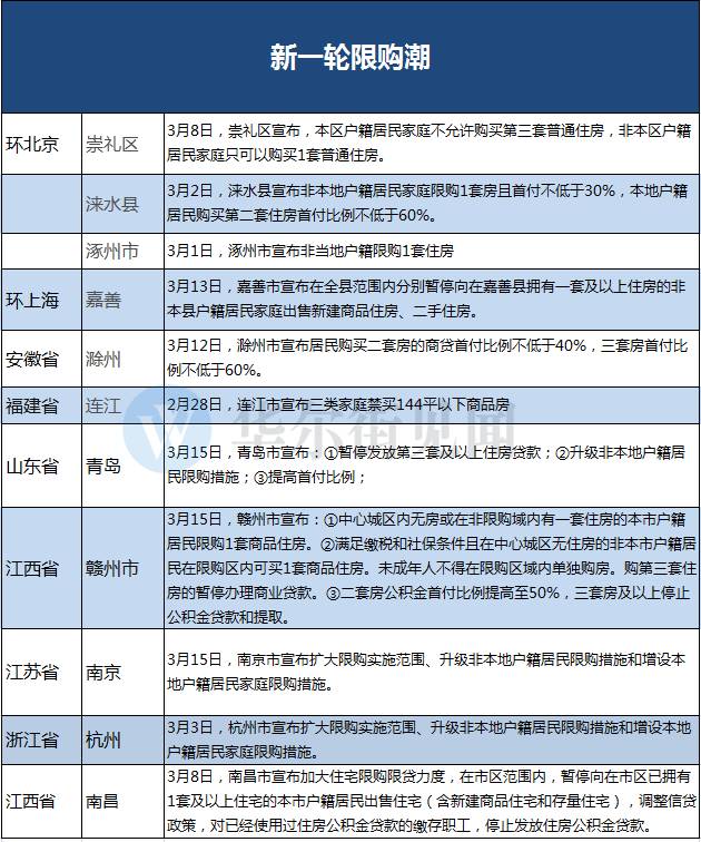 除限购之外,一些三四线城市也推出抑制楼市过热发展的新政。3月12日,安徽省滁州市也出台新政,规定居民购买二套房的商贷首付比例不低于40%,三套房首付比例不低于60%。下图由华尔街见闻整理↓