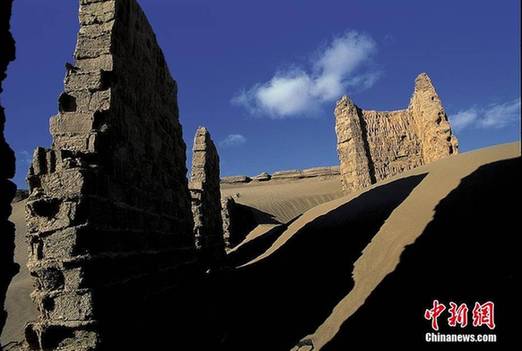 该城建于公元九世纪的西夏政权时期。公元1372年明朝大将冯胜攻破黑城后遭废弃。至今城内还埋藏着丰富的西夏和元代等朝代的珍贵文书。图为西夏遗址。
