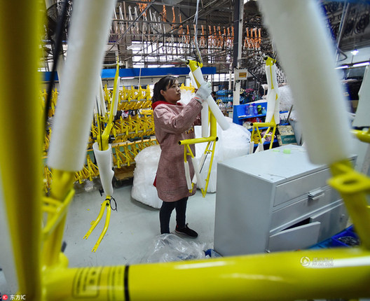 在自行车组装线上,21条组装线全力开足马力生产单车,这21条包括共享单车,也包括传统的自行车订单生产。