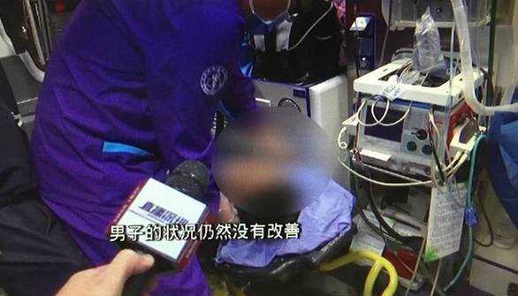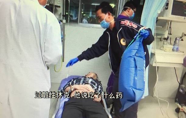 此时,这名男子躺倒在车上,脸部发黑,嘴唇发紫。抬上救护车时,急救医生发现他身上很多皮疹,判断其应该是过敏性休克,便马上给他吸氧,开通静脉,进行抗休克处理。