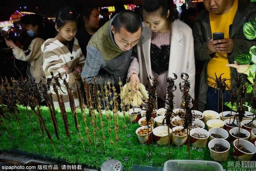 2017年3月19日,沈阳街头现重口味“昆虫宴”。一商贩现场油炸蜈蚣、蜘蛛、蝎子、蚂蚱、蜥蜴等昆虫进行贩售,现场吸引了不少市民围观拍照。图片来源:Sipa China