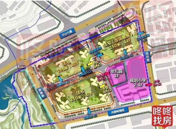 项目共4块用地,分为2期开发,共规划150米高度,44-47层的超高层住宅楼。