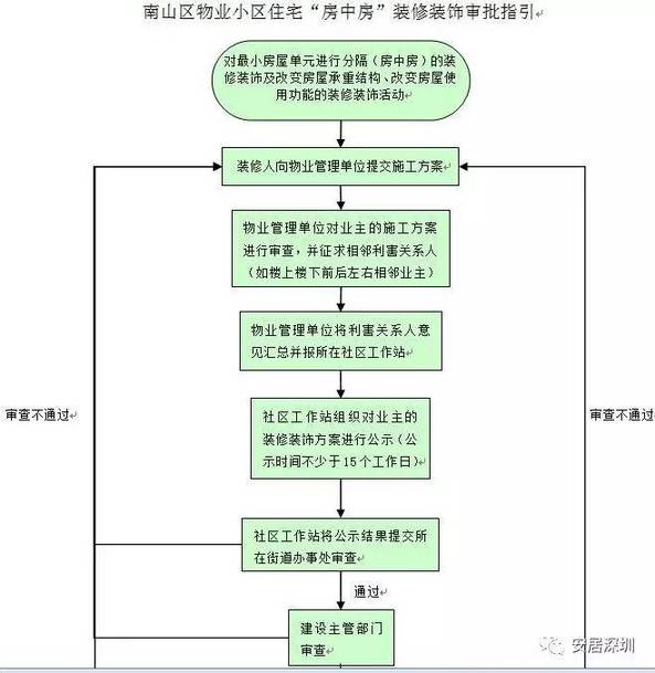 (一)物业服务企业应当按照《南山区物业小区住宅“房中房”装修装饰审批指引》及住宅装饰装修管理有关规定和管理规约要求,建立完善的住宅装饰装修管理制度。 装修申请人需根据《南山区物业小区住宅“房中房”装修装饰审批指引》中规定申报。