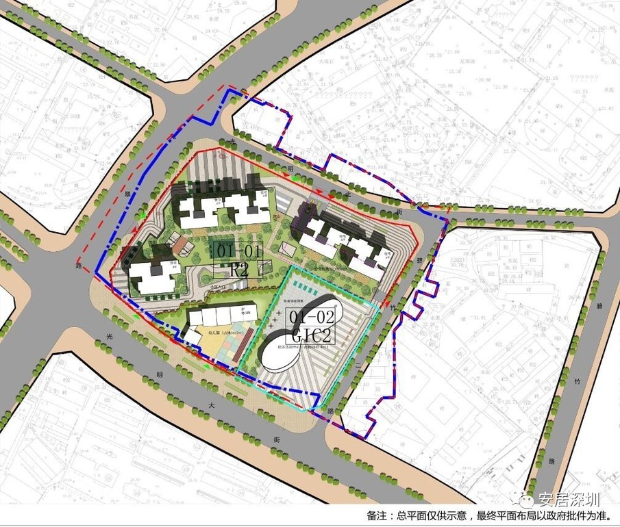 项目位于深圳市光明新区竹园片区,南依光明大街、西靠光翠路、属于光明新区光明办事处辖区。拆除用地面积34023.8平方米,开发建设用地面积18137.1平方米,计容积率建筑面积115420平方米。