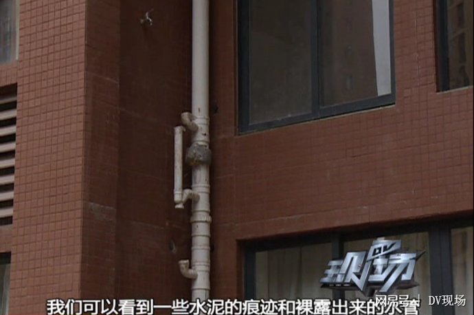 随后,记者来到了业主们口中的样板房,在样板房的外墙上,我们可以看到一些水泥的痕迹和裸露出来的水管,业主们告诉记者,这就是之前阳台所在的位置。