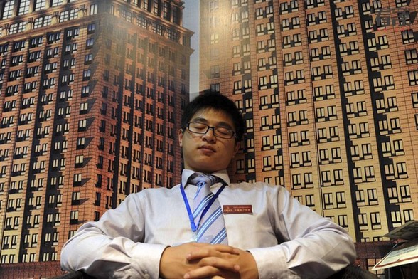 2011年12月11日,浙江嘉兴房展会上,一名销售人员午间小憩。2011年的中国楼市犹如一场博弈大战,高潮迭起。