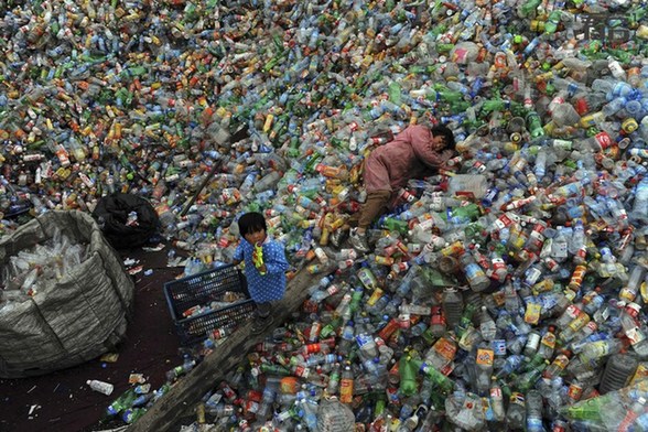 2011年11月6日,浙江省嘉兴市经济开发区城乡接合部一废品回收站,一名“破烂王”守着成堆的饮料瓶睡觉。