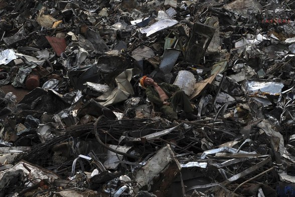 中国部分在都市生活的人常会因为压力大导致失眠,而同样所处这些城市中的另一些人,却能够随处“肆意”而睡。2011年9月9日,台州椒江港内,一名工人躺在小山般的“洋垃圾”上睡觉。曾经的浙江台州椒江港码头,随处可见一堆堆来自日本、美国等国运来的“洋垃圾”,从此处运至路桥区峰江分解。