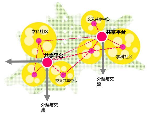 学科社区以150—300米为出行直径,配置体育场地、公共艺术交流区域、特色餐饮、交叉学习中心等功能与设施,形成一个系统化的共享创新和交流网络。