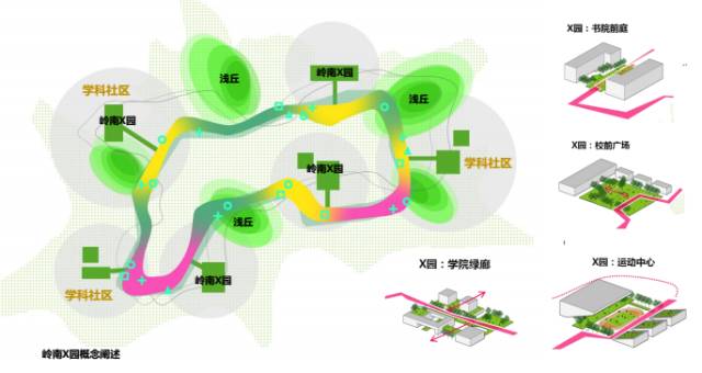 南科大地处岭南,校园建筑群通过若干岭南X园突出空间地方性与文化识别性,形成新岭南现代化前提下,具有新岭南特色的场所空间。