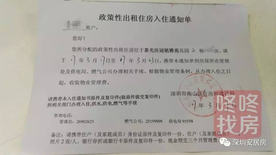 您所分配的政策性出租住房位于茶光路冠铭雅苑花园X栋Y房,请与17年3月17日至17年3月23日,携带本通知书到房屋所在管理处及供电局、燃气公司办理相关手续。根据物业管理条例,从办理入住之日起,收取物业管理费。