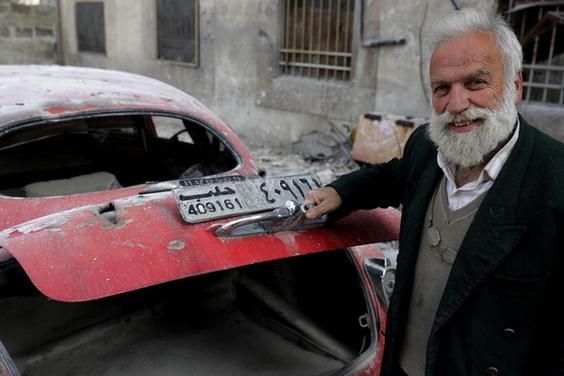 照片中这位笑容慈祥的老人叫做Mohammad Mohiedine Anis,今年70岁,来自叙利亚阿勒颇。他从上世纪50年代开始就喜欢收集老爷车,这些价值连城的老爷车,在老人眼里一直当做珍宝般对待,但是战争的到来彻底改变了这一切。他所居住的叙利亚阿勒颇地区是政府军和反政府武装争夺最激烈的战区。图为乐观的老人面对镜头仍然微笑了起来。