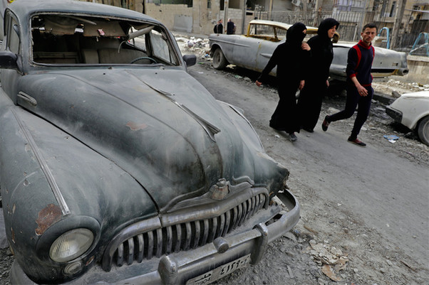 曾经线条优美的老爷车,如今变成了“独眼龙”,几位当地人从满是疮痍的街道走过,四周损毁的老爷车仿佛在默默的向人们讲述自己悲惨的遭遇。