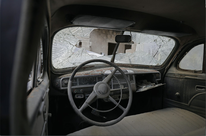2015年12月,叙利亚政府军向阿勒颇地区发起了猛烈的攻击,这些老爷大部分都是在那一周之内遭到毁坏的。这是辆1947年款的普利茅斯(1947 Plymouth)的驾驶室内,曾经漂亮的汽车现在已成了废品。