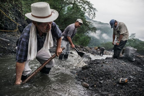 图中,一群挖矿人利用铁锹或双手在河水中寻找宝石,最前面的Carlos已是该地最老的矿工之一了。