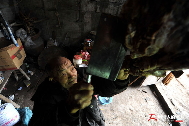 在里屋的洞顶下,老人晾挂了一些自己养杀的鸡。他说,这些是留给儿孙们回来的时候吃的。他生活极简,只有在周末才会切下一点晾挂在前屋横梁下的腊肉炒来吃。