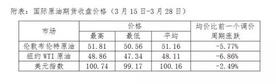 据国家发展改革委价格监测中心监测,本轮成品油调价周期内(3月15日-3月28日),美国原油产量不断增加,库存超预期增长,致使国际油价刷新年内低点,布伦特、WTI原油期货平均价格比上轮调价周期下降6.32%。