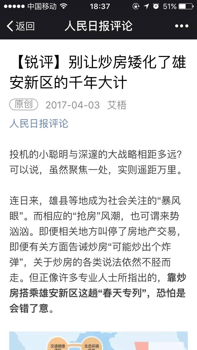 对于最近几天不少人涌入安新县,雄县和容城县的抢房者,人民日报今天(4月3日)发表评论文章称: