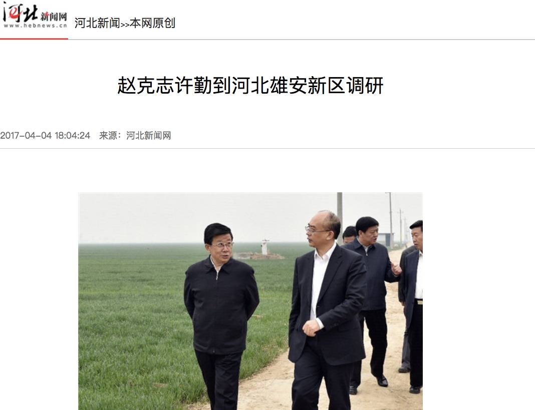据河北新闻网4月4日下午报道,4月3日至4日,河北省委书记、省人大常委会主任赵克志在雄安新区调研时强调,要加强规划、土地和房地产管控。要实施最严格的管控,省委、省政府派出督察组到新区重点区域开展督察,依法严厉打击黑房地产中介,打击各种不法行为,抓典型曝光,以正视听。