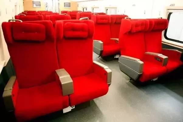 但我觉得中国高铁的二等座不如欧洲,比如法国TGV或者韩版KTX或者德国的ICE,欧洲高铁二等座布局是2+2而非中国的2+3,更宽一些。一等座的作为布局是2+2,座椅宽敞结实,椅套一般是红色。