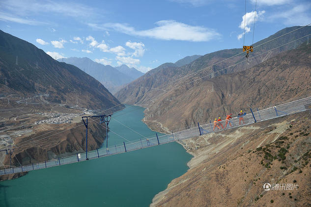 4月5日,四川甘孜藏族自治州泸定县,建设中的雅康高速泸定大渡河兴康特大桥,桥面施工便道——“猫道”已经架设完成,工作人员正在架设首根主缆索股。被誉为“川藏第一桥”的雅康高速泸定大渡河兴康特大桥开始架设首根主缆,预计2018年8月底建成贯通。成都商报记者王勤 摄影