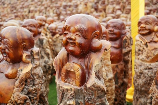 薛店镇一名负责人曾表示“移栽是为了保护”。他解释,花庄枣林处要引进建设多项工程,所以将枣树移栽。而新郑市林业局法制室一名工作人员表示,移树时,移栽手续并没有完成审批,程序上有问题。“如此粗暴的移栽,很难种活。”在当时,一位去过现场的园艺师表示,枣树被移后大部分被堆在空地上,部分已移栽入坑的枣树埋得浅,还没及时浇水。三年后,从花庄村挖来的古枣树成片枯死,在成片的荒草丛中,古枣树树干发黑挺立,如同一块块墓碑,“枣树生长慢,生态价值高,这都上百年树龄了,都说管好十亩田,不如管好一亩枣,看了这,心疼啊。”图为佛像群中一些体型较小的弥勒佛佛像。图片来源:视觉中国