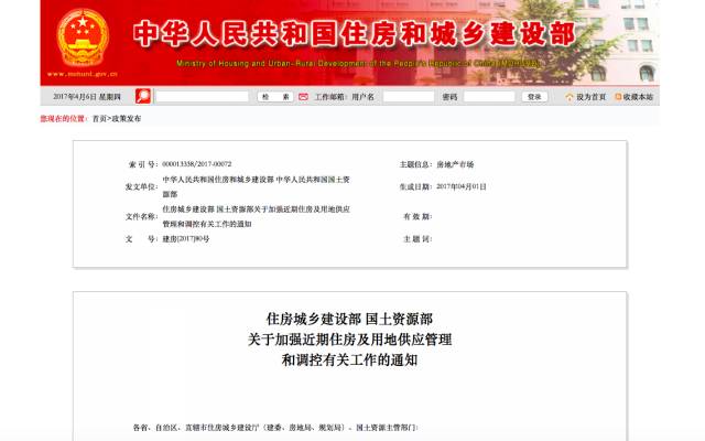 4月6日,中国住房和城乡建设部官网发布了由住建部和中国国土资源部共同签发的《关于加强近期住房及用地供应管理和调控有关工作的通知》(建房[2017]80号)。 这是自近期北京开启全国楼市调控升级后住建部第一次出台全国楼市调控的统领性文件。