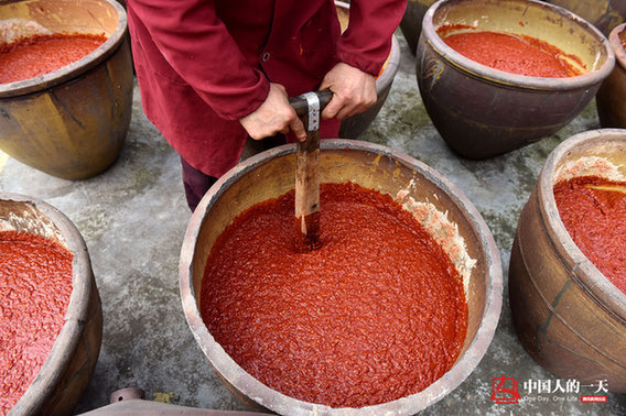 于是他就开始自己摸索,每天等大家都下班了以后,余绍军就一个人留在小小的配料房里钻研。历经10多年,上千次的失败和尝试,他终于酿出了跟师父同样口味的豆瓣酱。