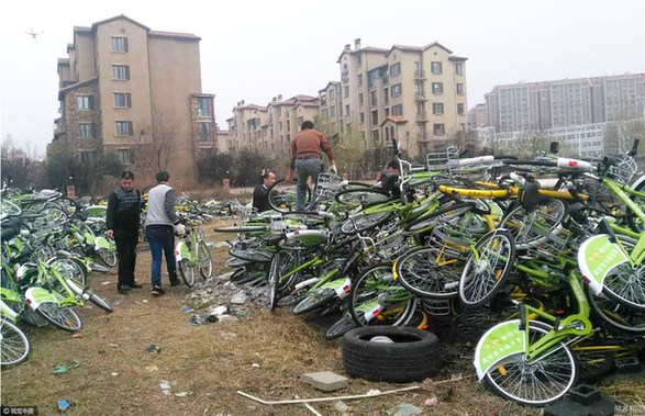 2017年4月5日,河南省郑州市农业东路与地秀街附近一处长满荒草的空地中,上百辆绿色和黄色的共享单车被重叠堆放在一起,场面壮观,如同单车“坟场”。图片来自视觉中国
