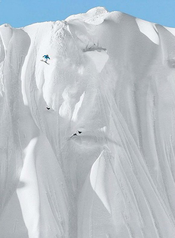 冰川恐惧:没有什么比高山运动更加极限刺激了。一位滑雪者正在冰山上滑雪。
