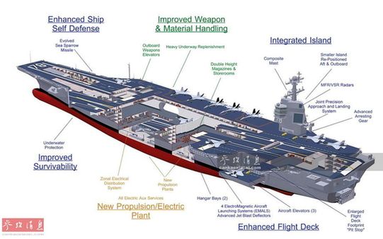 福特级全长337米,全宽41米,满载排水量10万吨,搭载有2座A1B压水堆,最大航速超过30节,最多可搭载90架固定翼战机和直升机。