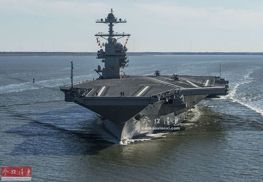 由于采用了包括电磁弹射器、双波段相控阵雷达等多项新技术,福特号被称为史上最昂贵航母,单艘造价约130亿美元。图为舰艏角度拍摄的“福特”号航母特写。