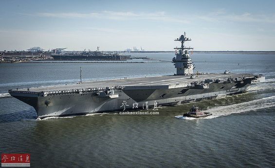 正在驶离港口的“福特”号核航母,背景可见正在维护中的“华盛顿”号(尼米兹级,CVN-73)核航母。