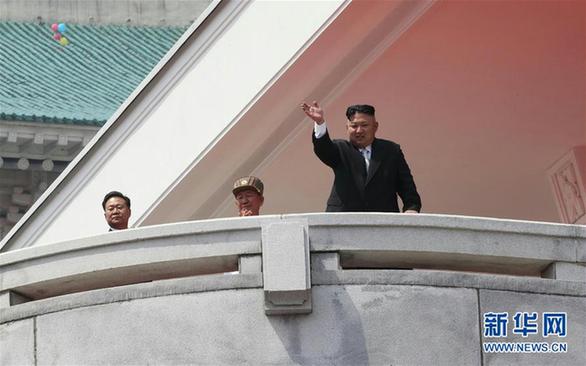 4月15日,在朝鲜首都平壤,朝鲜最高领导人金正恩(右)向参加群众游行的平壤市民挥手致意。朝鲜15日在平壤举行纪念金日成诞辰105周年的阅兵式和群众游行,并展示了朝鲜最先进的导弹装备。新华社记者朱龙川摄