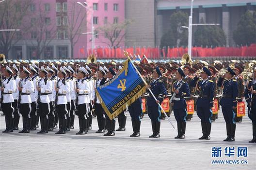 4月15日,在朝鲜首都平壤,朝鲜人民军参加阅兵式。朝鲜15日在平壤举行纪念金日成诞辰105周年的阅兵式和群众游行,并展示了朝鲜最先进的导弹装备。新华社记者朱龙川摄