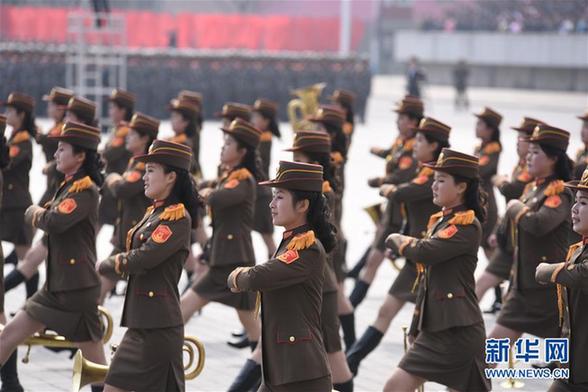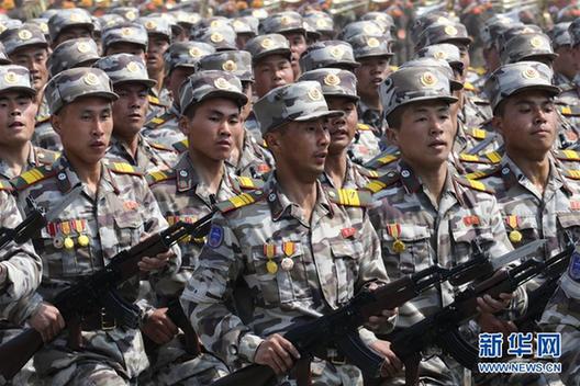 4月15日,在朝鲜首都平壤,朝鲜人民军参加阅兵式。朝鲜15日在平壤举行纪念金日成诞辰105周年的阅兵式和群众游行,并展示了朝鲜最先进的导弹装备。新华社记者程大雨摄