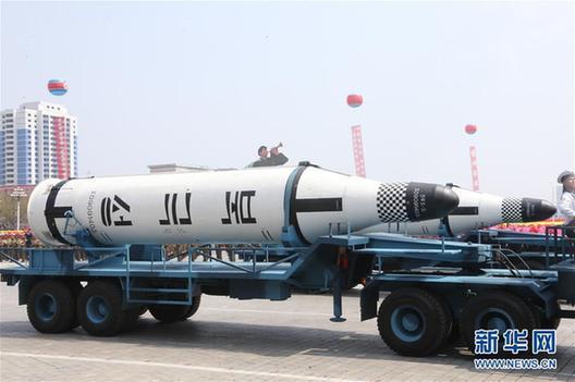 这是4月15日在朝鲜首都平壤举行的阅兵式上拍摄的军事装备。朝鲜15日在平壤举行纪念金日成诞辰105周年的阅兵式和群众游行,并展示了朝鲜最先进的导弹装备。新华社记者朱龙川摄
