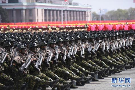4月15日,在朝鲜首都平壤,朝鲜人民军参加阅兵式。朝鲜15日在平壤举行纪念金日成诞辰105周年的阅兵式和群众游行,并展示了朝鲜最先进的导弹装备。新华社记者程大雨摄