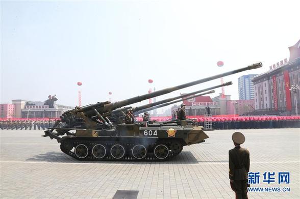 这是4月15日在朝鲜首都平壤举行的阅兵式上拍摄的军事装备。朝鲜15日在平壤举行纪念金日成诞辰105周年的阅兵式和群众游行,并展示了朝鲜最先进的导弹装备。新华社记者朱龙川摄