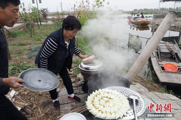 4月16日,白洋淀的居民为住在家中的游客煮饺子。尽管白洋淀尚未到旅游旺季,但是周末时间游客明显增多。中新社记者 毛建军摄