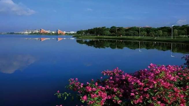 松山湖自然环境优美,沿湖岸及沿岸岛屿种植了桃花、梅花等15万株格式各样花卉,四季皆有美景。风景区内有松山湖花海、状元笔公园、月荷湖公园、中心公园等特色景点。